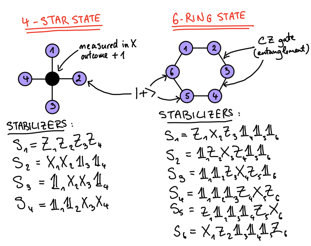 To understand both the 4-star and the 6-ring states, we need one last piece of the puzzle and this is one that is very familiar to anyone that’s ever worked with MBQC: graph states. The basic idea is that you have a simple way to generate and describe the large entangled cluster states needed for an MBQC computation, specifically via stabilizers. Luckily, the graph state formalism turns out to be useful in FBQC too.
