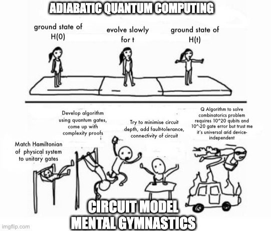 For plenty of problems, this ‘useful’ physical system isn’t a very complicated one (see the power of the Ising Hamiltonian). One of the real issues in AQC is the condition of slow evolution (the other is a power requirement, but it’s a lot more nuanced so we’ll stick to slowness for now). For a process to be genuinely adiabatic in the quantum sense, it has to happen infinitely slowly. As mentioned in my other blog post, this is due to the quantum adiabatic theorem and exponentially small energy gaps of your system. So in practice, what we’re always dealing with are quasi-adiabatic processes, where a system gets driven slowly enough as to minimise these losses and transitions.